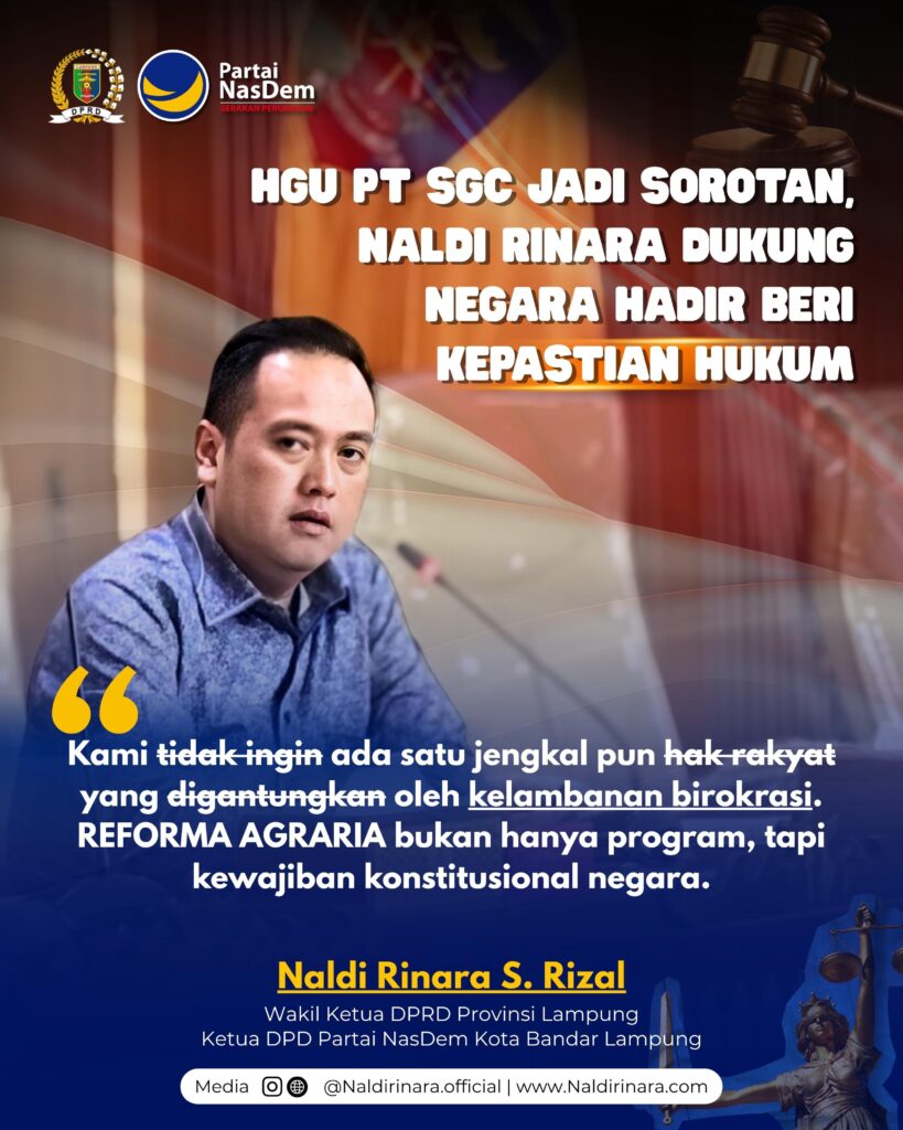 Lampung- Wakil Ketua DPRD Provinsi Lampung, Naldi Rinara mengungkapkan PT. Sugar Grup Company (SGC), ketidaksinkronan data lahan HGU SGC, BPN Provinsi Lampung harus terbuka Mengklarisifikasi tidak bisa dianggap sepele, karena menyangkut tanggung jawab sosial, serta keadilan bagi masyarakat. Kamis, (07/08/2025) Berdasarkan data BPN Tahun 2019, PT SGC mengelola 75,6 ribu hektar, sementara data ATR BPN […]